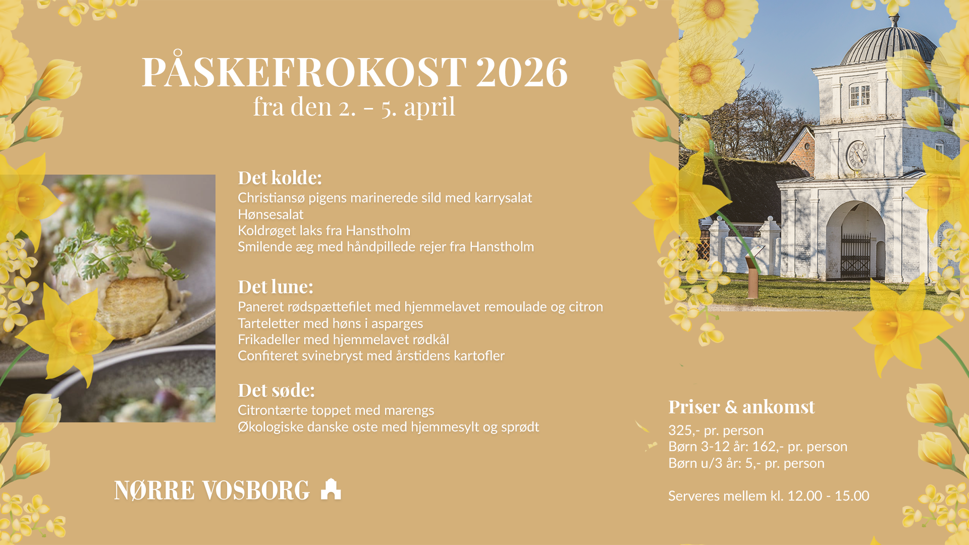 Påsken er noget ganske særligt på Nørre Vosborg, og en tradition som vi og mange gæster holder meget af. Tag hele familien med ud på herregården og nyd en gåtur i den smukke natur inden jeres frokost.